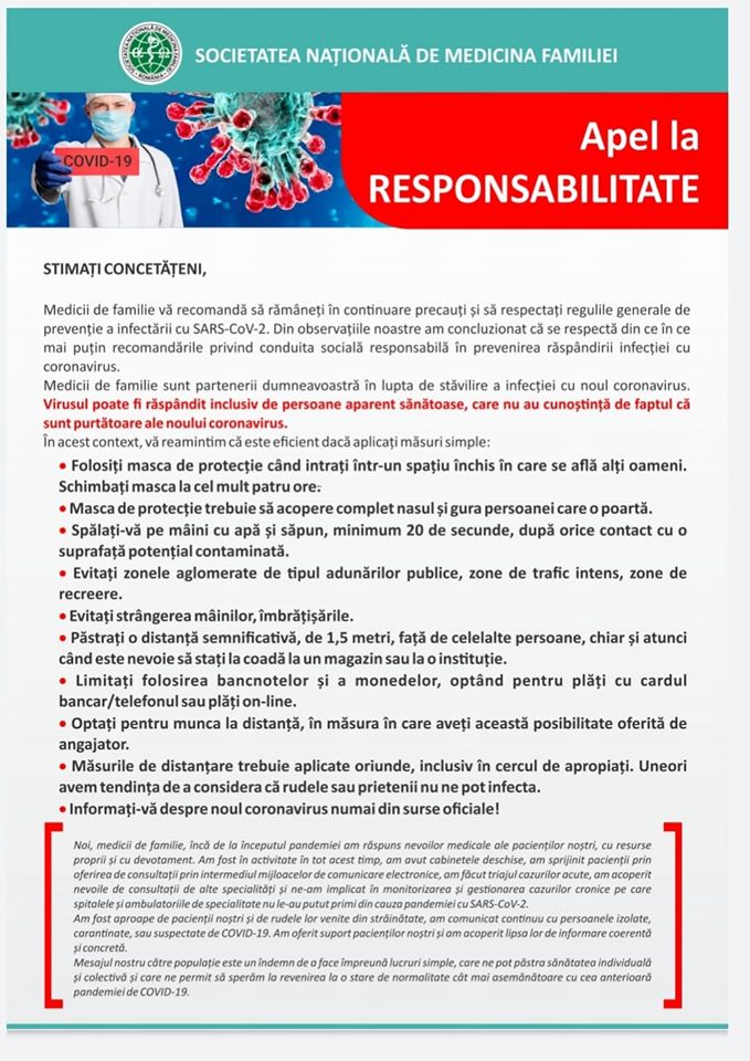 Mai jos este un apel din partea Societatii Nationale de Medicina Familiei si va sfatuim sa respectati masurile impuse de specialisti.